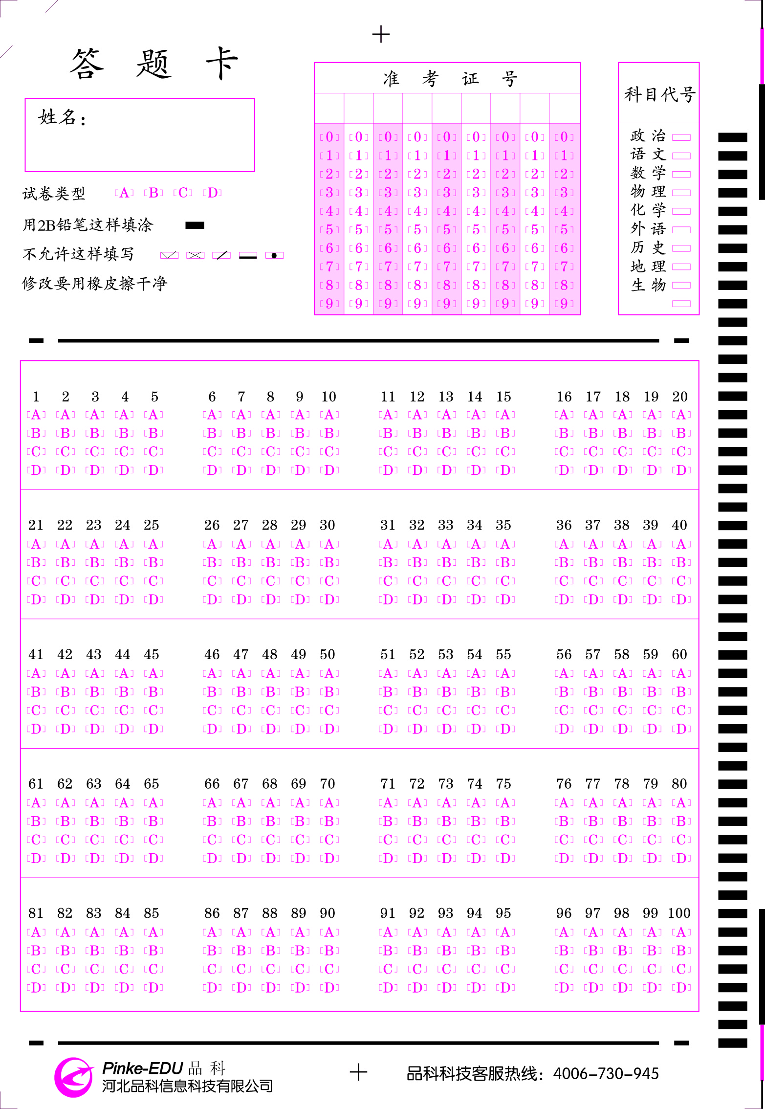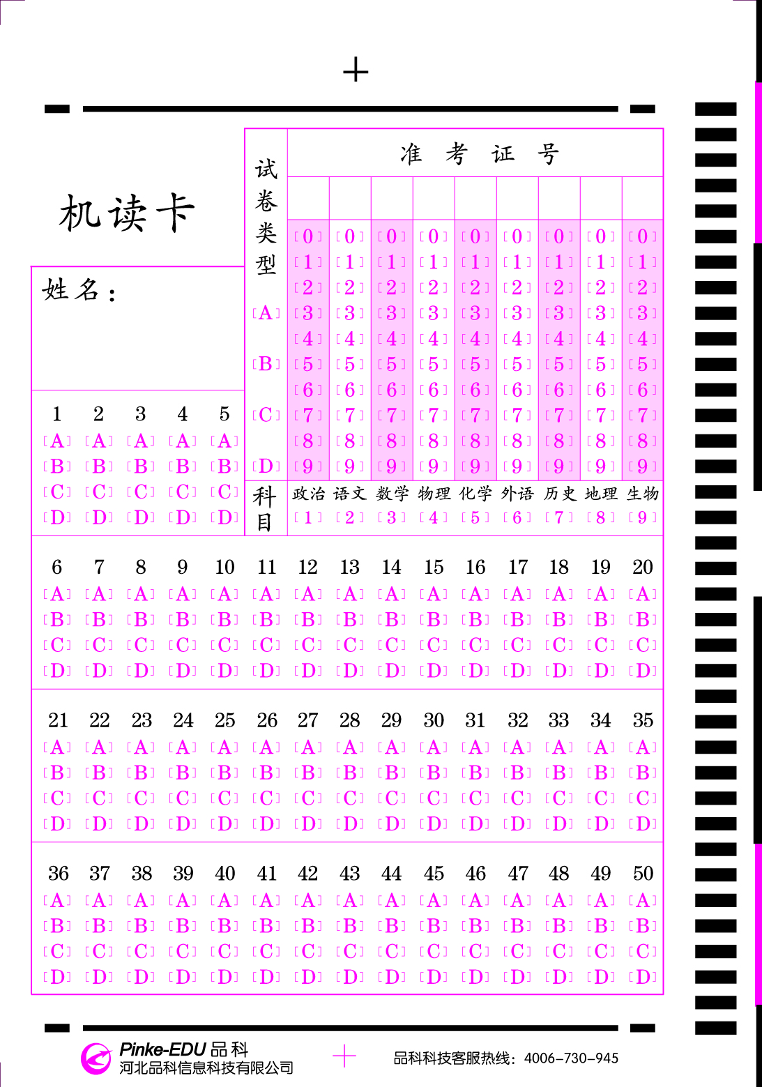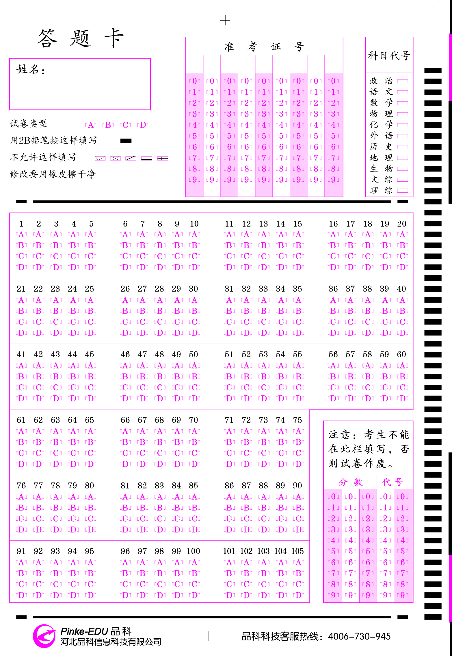 50題通用卡 105題通用卡 75題模擬答題卡